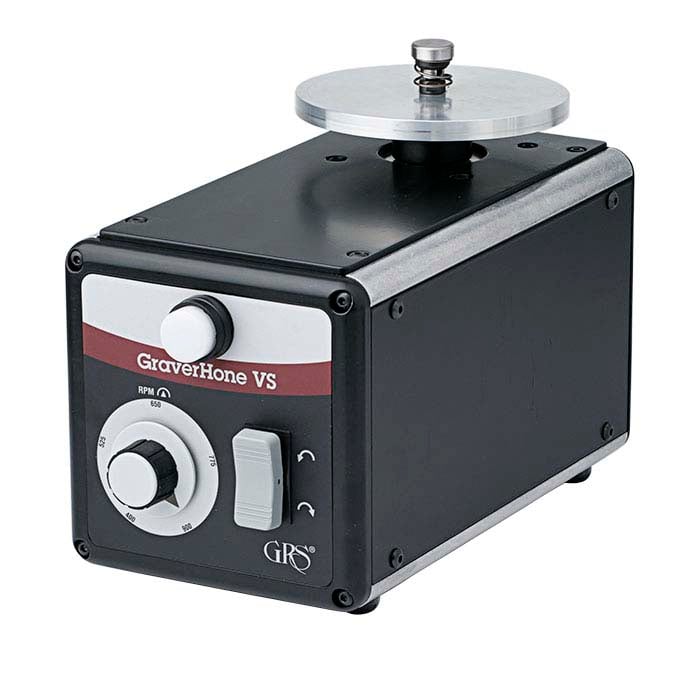 Quickly shape, sharpen and polish your carbide and high-speed steel gravers with the GRS® GraverHone® VS. The unit enables you to produce precise, sharp tool edges that make bright cuts with clean lines and rich shading. An adjustable speed dial (400–900rpm) makes it perfect for a variety of sharpening tasks—run at lower speeds to prevent overheating tool steel and operate at higher speeds to efficiently sharpen carbide gravers. The high-torque motor easily handles aggressive sharpening tasks and the direct-drive system provides a long life with quiet operation. Each GraverHone® has a spindle and drive plate are individually aligned with the top of the unit to consistently deliver repeatable grinds Dual direction makes the unit ideal for right- or left-handed users. A quick wheel-change adapter with no threads allows you to change wheels in just a couple of seconds. The GraverHone has a durable steel housing.