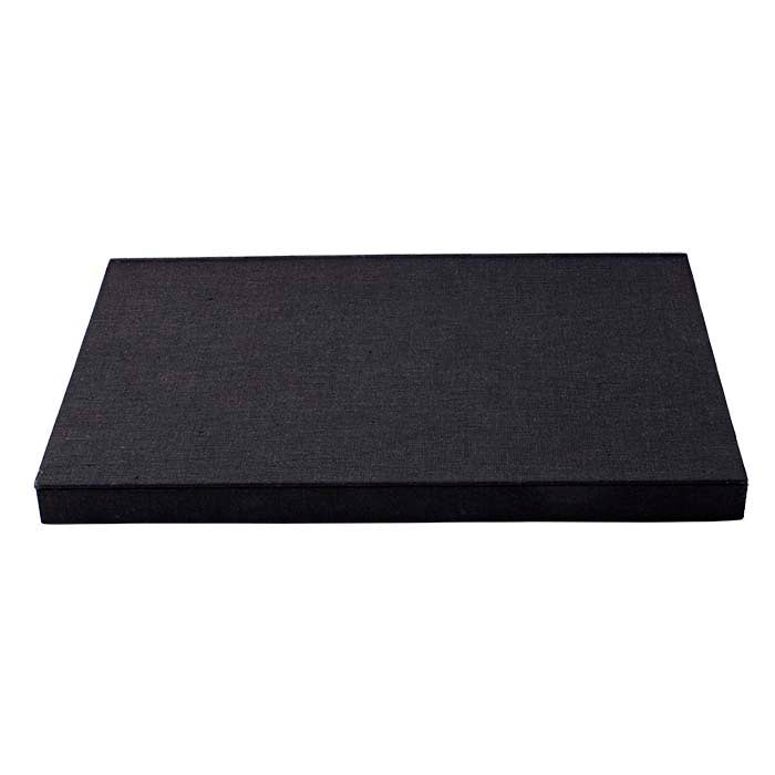 Bruk denne enkle svarte forhøyningen for å heve utvalgte smykker eller stativer, og skape visuell variasjon i en utstilling av smykker i lignende størrelse. Den ekstra høyden trekker oppmerksomhet og gir tekstur til større eller mer komplekse utstillingsoppsett. Den flate, rektangulære formen på denne forhøyningen gjør den også nyttig som en utstilling på toppen av en monter; flytt individuelle smykker fra innsiden av monteren til forhøyningen for nærmere inspeksjon av kunden. Stoffet har en svart farge og en naturlig, subtil tekstur som gjør det til en attraktiv bakgrunn for enhver smykkestil. Farget svart lin dekker en form av papp og polystyren.