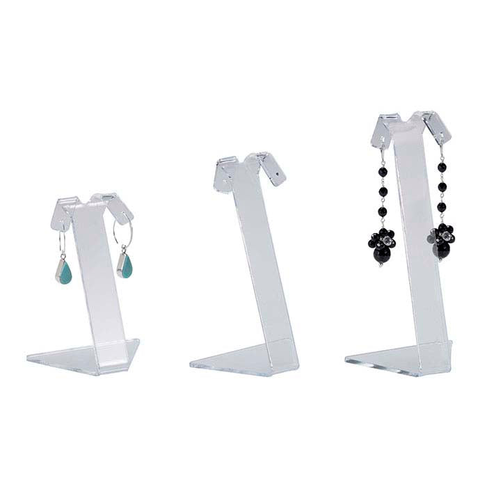 Dette settet med tre graderte klare akrylstativer holder ett par øredobber på hvert stativ; det enkle buede designet lar øredobbene henge fritt, slik at kundene kan se hvordan de vil se ut når de bæres. Stativene er ideelle for å lage oppreiste utstillinger for ett eller flere par øredobber. Den ekstra høyden trekker oppmerksomhet til individuelle øredobber og gir dybde til mer komplekse utstillingsoppsett. Laget av 1/8" tykt klart akryl med glatte kanter. Dette settet inkluderer tre stativer, ett av hver: