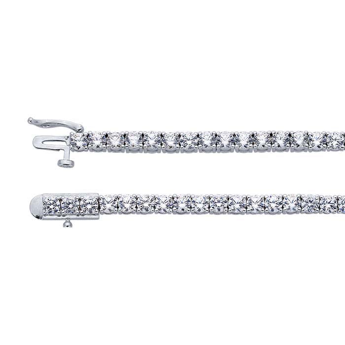 This finished sterling silver tennis bracelet is set with round white CZs in four prong settings. A fold-over clasp completes the bracelet.