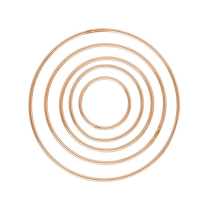 De 14/20 roségullfylte konsentriske runde komponentene i dette settet øker gradvis i størrelse og har en glatt, blank finish. Bland og match størrelser og former for å lage halskjeder og armbånd, eller bruk dem som elementer i asymmetriske øredesign. Dette settet inkluderer én av hver av fem størrelser: 39,8 mm, 31,8 mm, 25,1 mm, 20,0 mm og 13,8 mm. Roségullfylte komponenter gir denne svært ettertraktede gullfargen og lar deg designe med den edle metallfølelsen kundene ser etter—til en pris kundene setter pris på.
