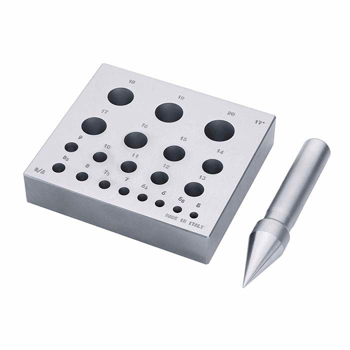 - et enkelt, 17° vinklet stempel presist maskinert for å passe hver bezelstørrelse i settet