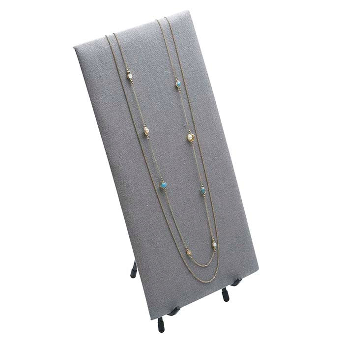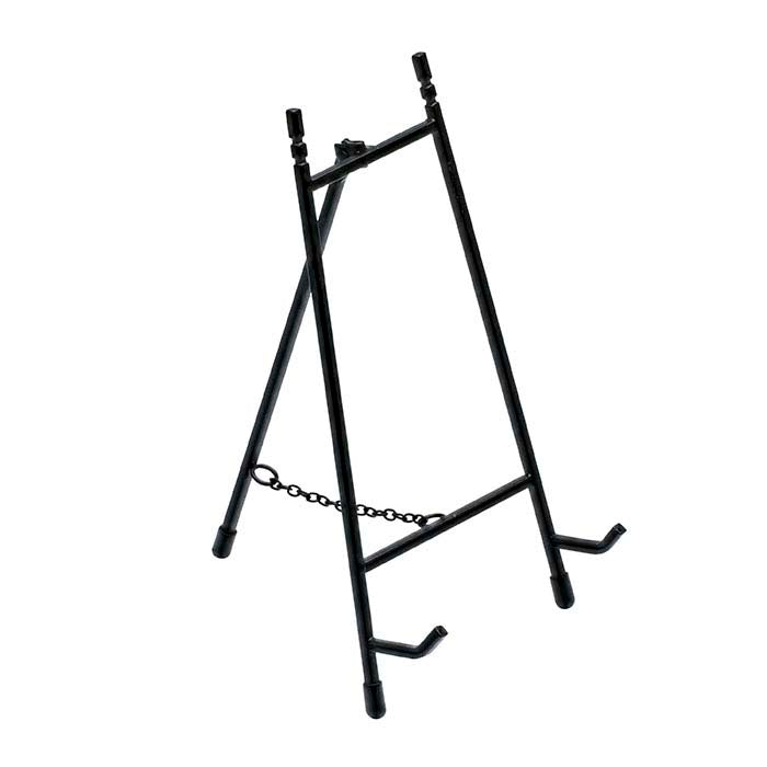 Dette velutformede svarte metallstaffeliet er en perfekt måte å vise frem en fullstørrelse smykkepad (ikke inkludert) som et miniatyrkunstverk. Staffelier viser smykker i en attraktiv, lett synlig vinkel med den ekstra fordelen at det kan foldes flatt for sikker, plassbesparende oppbevaring og transport. Beskyttende føtter på staffeliets ben forhindrer riper eller merker på utstillings- eller benkeoverflater; det leddede bakbenet er festet med en svart metallkjede i matchende farge.