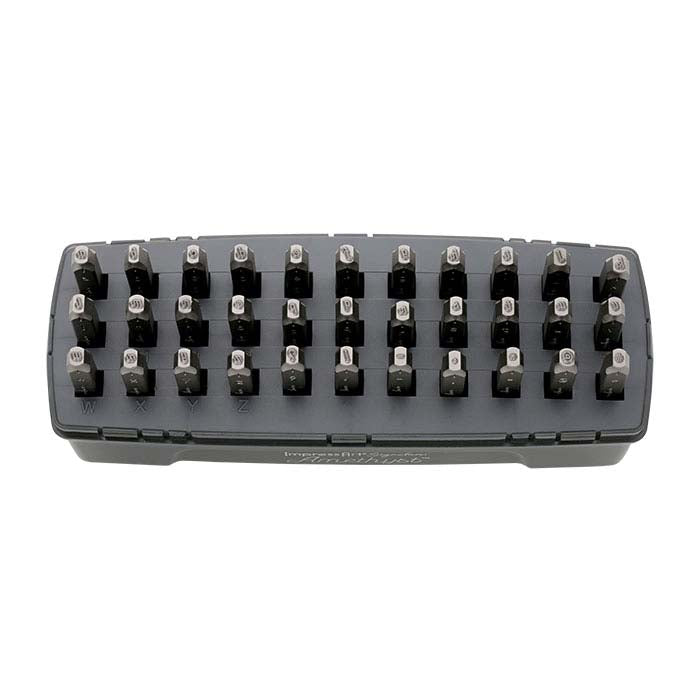 Legg raskt til dekorative bokstaver eller egendefinerte fraser i smykkedesignene dine med dette ImpressArt® alfabet designstempelsettet. Disse stemplene har rette skaft og er perfekte for merking av flate overflater som kvalitets- eller merkeetiketter, skiver, stemplinger og andre komponenter. Hvert stempel er merket på siden for enkel identifikasjon og orientering. Dette settet inkluderer hele alfabetet (A–Z) pluss syv ekstra former og tegnsetting, og leveres i et sporingsetui (6-3/4"B x 2-1/2"D x 3-1/4"H) med klart lokk for enkel, organisert oppbevaring. ImpressArt® stempler er kuttet fra herdet stål og testet for Rockwell-hardhet og perfekt justering. De er utmerkede for stempling av myke metaller inkludert messing, kobber, nikkelsølv, gull, sølv og aluminium. Stempler med rett skaft har en flat tuppflate som står vinkelrett på verktøyskaftet. Designet for å fungere perfekt med den spesiallagde Ergo-Angle™ stempelhammeren og Simple Strike Jig™ (selges separat), er disse stemplene holdbare og gir konsekvent metallstemplingsresultat når du lager tilpassede, personlige smykker. For best resultat – og fordi et stemplet merke ikke er lett å fjerne når det først er laget – er det viktig å øve før du prøver å merke smykkedesignene dine. Skrapbiter av plate- eller flate basismetallkomponenter er ideelle for å hjelpe deg å få følelsen av både stempelet og kraften som trengs for et effektivt hammerslag. Bruk en messingklubbe for å slå på stempelet for å forhindre skade på stempelet, og støtt arbeidsstykket på en benkeblokk eller et ambolt. Til slutt, gjør stemplingen før du setter inn steiner slik at det ikke er risiko for å skade innfatninger eller løsne innfattede steiner.