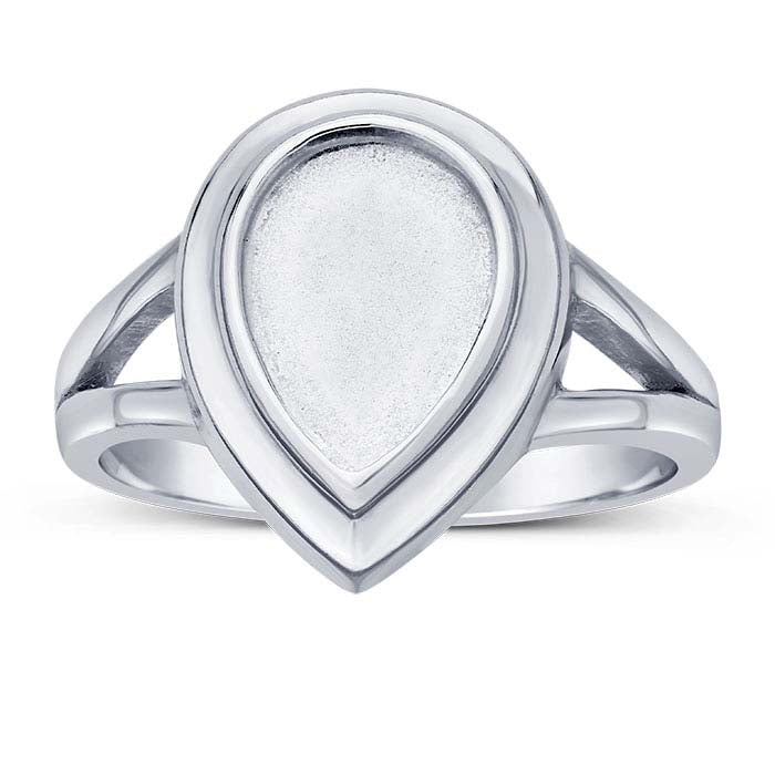 This sterling silver ring mounting features a split-shank design and a bezel setting that accommodates one 10 x 7mm pear-shaped cabochon. Use jeweler's epoxy to secure your stone into the bezel.