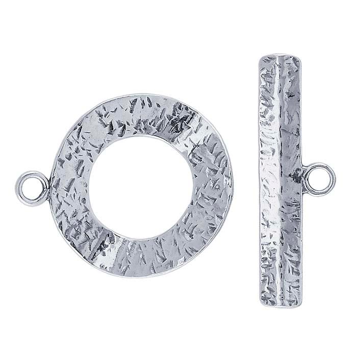 This sterling silver toggle clasp features an attractive all-over patterned texture that catches and reflects light. It is durable yet lightweight and pairs well with beaded and fabricated bracelets and necklaces made with silver components. A toggle clasp is a two-part clasp consisting of a ring and a bar. The bar end requires a short length of chain to allow it to slide lengthwise through the ring, then turn sideways so that it cannot fit back through the ring, effectively closing the jewelry piece. To open, the bar is simply pulled further through the ring just far enough to allow it to turn lengthwise again and slide back through the ring.