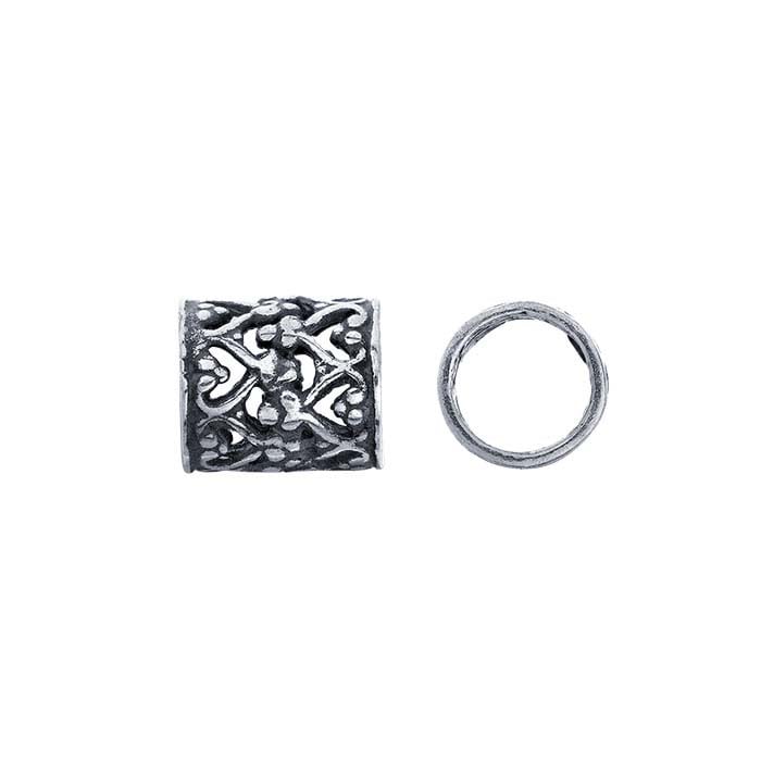 This sterling silver tube bead features a filigree heart design and a large hole (approximately 4.5mm), making it ideal for use on substantial chain or cord, or to unite multiple strands and is oxidized to highlight the detail. Use an individual bead to complement round beads and other strung elements in drops and pendants for bracelet, necklace or earring designs.