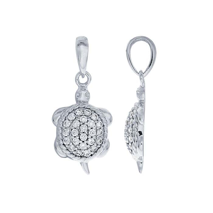 This sterling silver pendant features a 3D turtle and is set with several round white CZs on the shell. It looks great on its own or combined with other charms and components. A rhodium plating ensures a durable, tarnish-resistant finish. This pendant includes a tapered bail.