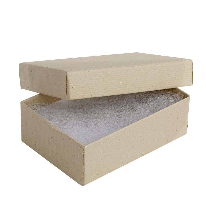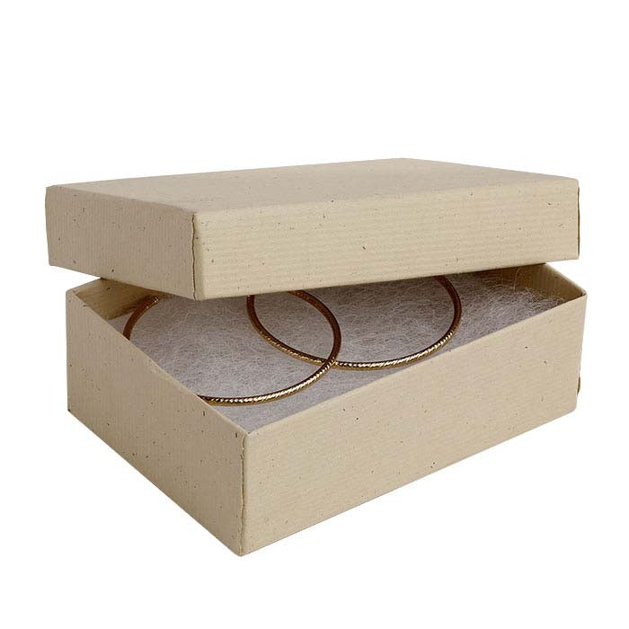 Denne to-delte universale esken med papiromslag rommer en rekke smykkestiler. Bruk esken som den er, eller kombiner den med ensfargede pappesker for å lage fargekombinasjoner som passer ditt merke, til sesongbasert emballasje eller spesielle anledninger. Legg til et dekorativt bånd, gaveinnpakning eller sløyfe (selges separat) for å tilpasse hver eske. Esken er dekket med hvete-farget resirkulert papir (100 % post-consumer fiber) og laget av 100 % resirkulert papp (med 90 % post-consumer fiber og 10 % pre-consumer fiber); esken inkluderer en 1/2" tykk hvit polyfill som ikke vil forårsake misfarging. Hot-stamp din gaveeske med firmanavn eller logo for å holde deg i minnet lenge etter smykkesalget.