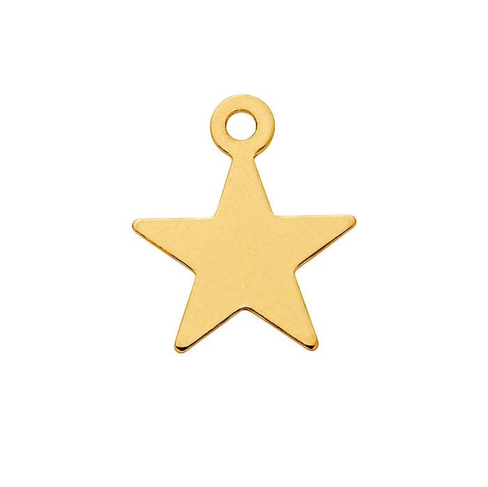 Ten mały zawieszkowy element z żółtego złota 14/20 ma wzór pięcioramiennej gwiazdy z jasnym wykończeniem. Jego rozmiar sprawia, że jest doskonałym wyborem na kolczyk z zawieszką, a także idealnym rozwiązaniem do projektów naszyjników i bransoletek na łańcuszku lub na sznurku.