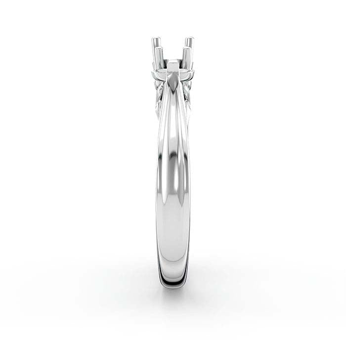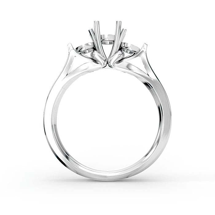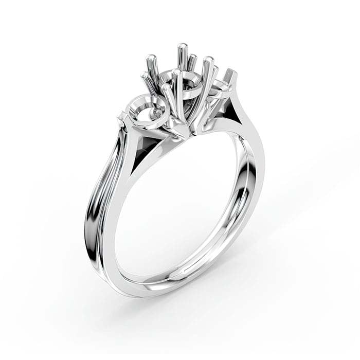 Ta oprawa pierścionka z białego złota 18-karatowego ma trzy miejsca na kamienie. Centralna oprawa z 4 zaciskami mieści okrągły fasetowany kamień o średnicy 5 mm (ok. 1/2 ct.), natomiast dwie boczne oprawy z 3 zaciskami mieszczą owalne kamienie 5 x 4 mm. Wytnij miejsce w zaciskach, aby dopasować kamienie, a następnie wypoleruj zaciski na kamieniach, aby je zabezpieczyć.