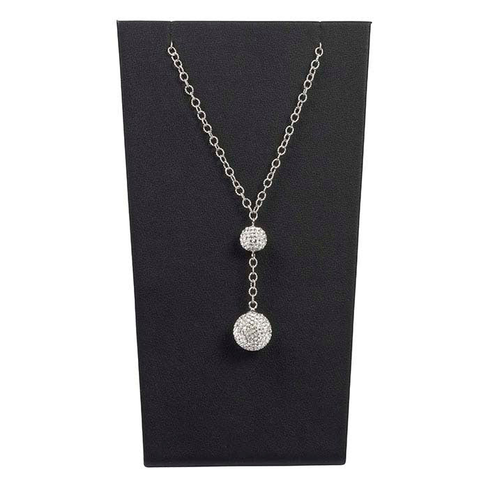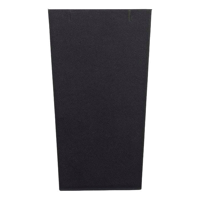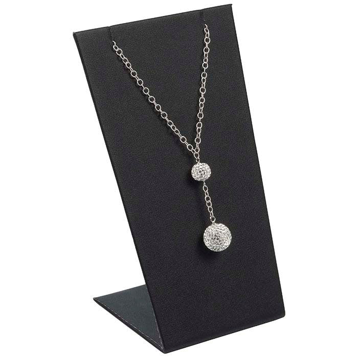 Ten solidny stojak wystawowy w klasycznej czerni to szybki, łatwy i atrakcyjny sposób prezentacji pojedynczego wisiorka; front stojaka ma delikatne zwężenie, które nadaje mu wyrafinowany wygląd. Stojak jest ustawiony pod niewielkim kątem dla optymalnego oglądu. Nacięcia na górze stojaka utrzymują wisiorek na pożądanej długości do ekspozycji. Aby wyeksponować pasującą parę kolczyków, wystarczy zawiesić je na górze ramy. Klasyczna czarna ekoskóra doskonale komponuje się z każdym stylem i kolorem biżuterii, od delikatnych łańcuszków po jasne kamienie szlachetne. Stojaki są idealne do tworzenia pionowych ekspozycji dla jednego lub więcej łańcuszków czy naszyjników; dodatkowa wysokość przyciąga uwagę do wybranych elementów i nadaje teksturę bardziej złożonym aranżacjom wystawowym. Czarna ekoskóra Vienna™ pokrywa metalową formę ustawioną pod kątem.