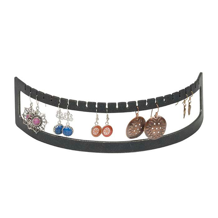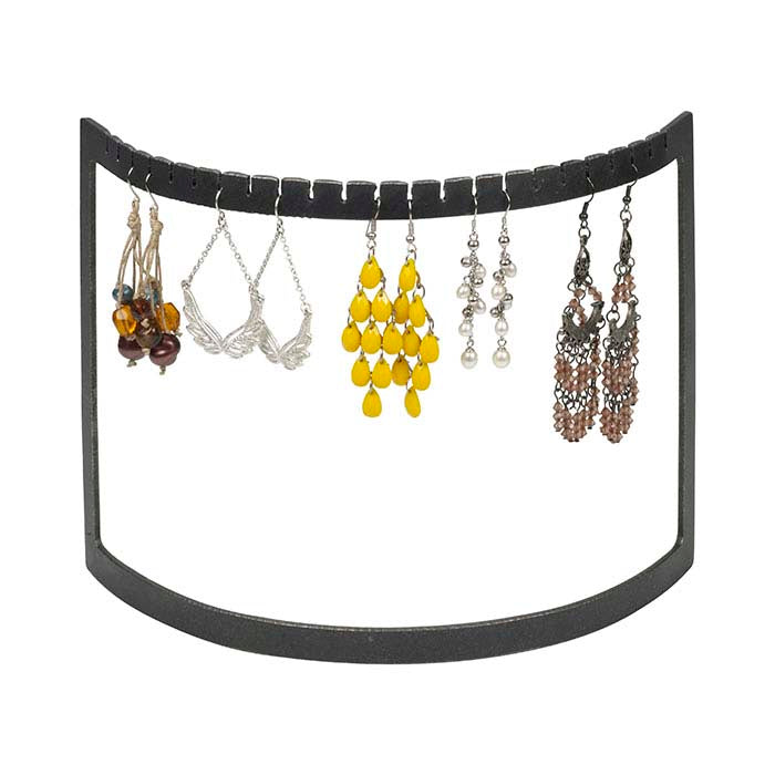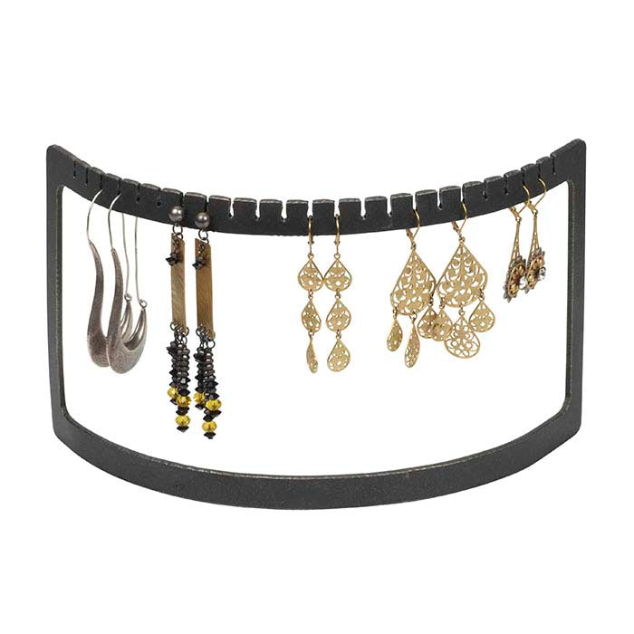 Ten ręcznie kuty metalowy stojak na kolczyki dodaje wyjątkowego charakteru Twoim ekspozycjom biżuterii, jednocześnie eksponując Twoją pracę na pierwszym planie. Stojak mieści 11 par kolczyków na drucikach; pojedyncze nacięcia zapobiegają przesuwaniu się i zbijaniu. Stojak został stworzony przez kowala Stevena Bronsteina, który dąży do tworzenia dzieł łączących "pierwotny urok kowalstwa z energią i zainteresowaniem bardziej współczesnym wzornictwem." Ten ręcznie kuty stojak wykonano w 85% z materiałów z recyklingu i wykończono naturalnym woskiem ochronnym, aby zapobiec dalszej korozji.