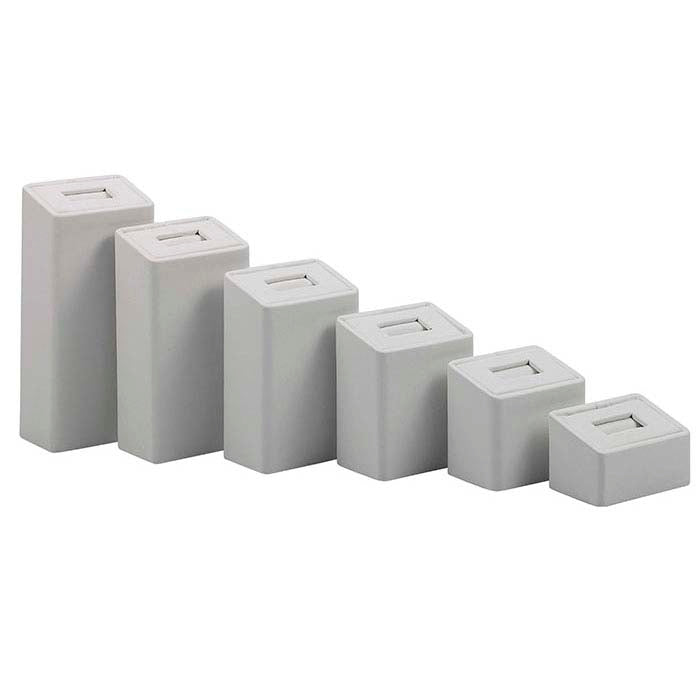 This set of white faux leather pedestal ring displays are perfect for showing off a collection of rings, giving each ring its own spotlight. Angled pedestal tops show the rings at their best angle for viewing; each pedestal holds a single ring in a padded slot. The white faux leather is a great complement to any color jewelry metal, and shows off colored gemstones beautifully. The graduated heights make it simple to stagger the heights of your display; arrange the pedestals in a single graduated row, or arrange as you wish to give depth to more complex display arrangements. White faux leather covers padded wood and cardboard forms.This set includes six 2-1/4" x 1-1/2" rectangle pedestals of graduating heights: