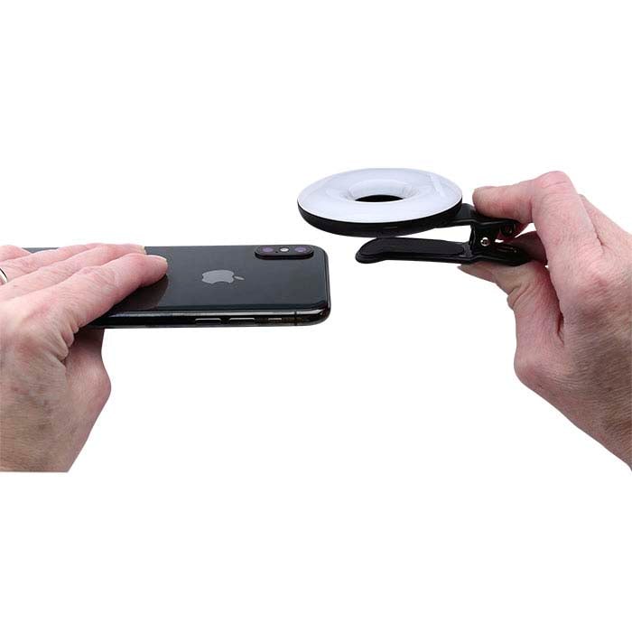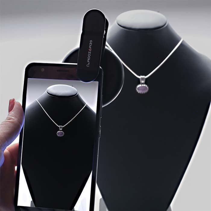 Wykonuj niesamowite zdjęcia z bliska lub filmy w wysokiej rozdzielczości swoich wyrobów jubilerskich za pomocą iPhone'a, iPada lub telefonu z Androidem, korzystając z tego pomysłowego, klipsowego powiększacza Gem-Zoom™ U Universal 10X z podświetleniem — zaprojektowanego tak, aby pasował do większości telefonów i tabletów. Wystarczy rozchylić klips i umieścić Gem-Zoom na telefonie lub urządzeniu, centrować powiększacz (0,65X) nad obiektywem aparatu; klips jest wyłożony gładką gumą, zapewniającą pewny chwyt. Gem-Zoom zawiera wbudowany pierścień świetlny, który zapewnia jasne oświetlenie w razie potrzeby. Pierścień świetlny oferuje trzy poziomy intensywności ultra jasnego białego światła: niski, średni i wysoki. Po zamocowaniu Gem-Zoom wystarczy ustawić ostrość i robić zdjęcia tak jak zwykle. Gem-Zoom współpracuje z funkcją zoomu w smartfonie lub tablecie. Gem-Zoom™ U Universal Macro 10X pasuje do iPhone 8, 8Plus, X, 7, 7Plus, 6, 6s, 6sPlus, 5, 5s, 5c, 5SE oraz każdego telefonu z Androidem, którego obiektyw aparatu znajduje się nie dalej niż 20 mm od górnej lub bocznej krawędzi aparatu. Gem-Zoom™ U Universal jest dostarczany w ochronnym, wyściełanym nylonem twardym etui typu clamshell z zamkiem błyskawicznym; system zawiera także gwintowany obiektyw szerokokątny (10X), mikrofibrową ściereczkę tła (idealną również do usuwania kurzu z soczewki powiększającej), 6-calowy kabel USB do ładowania (USB A do USB Micro B) oraz instrukcję obsługi. Czas ładowania wynosi 15 minut; ładowanie wystarcza na 25–45 minut ciągłego użytkowania.