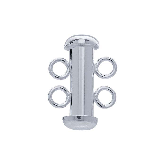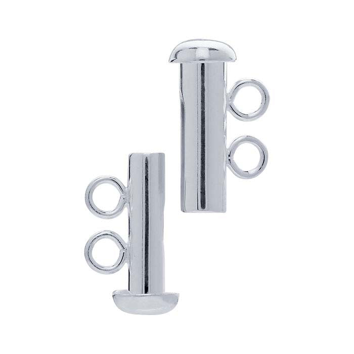 Ten zapięcie rurowe ze srebra próby 925 mieści dwie nitki i jest łatwe do otwarcia i zamknięcia oraz ma ciasne, mocne dopasowanie, które jest idealne do bezpiecznego trzymania ciężkich lub wielu nitek naszyjnika lub bransoletki. To zapięcie ma szeroką szczelinę między nitkami, co pozwala na większe koraliki. Aby użyć, zawiąż lub zaciskaj nitki na dołączonych pierścieniach. Zapięcie typu slide, czyli rurowe, jest idealne do naszyjników wielonitkowych i nitek koralików. Ten styl jest dostępny w konfiguracji na dwie do dziesięciu lub więcej nitek. Ponieważ dwie części rurki przesuwają się wzdłużnie, ale leżą bokiem na noszącym, ciężar naszyjnika zapewnia napięcie, które pomaga utrzymać zapięcie bezpiecznie zamknięte. Dodatkowo, ponieważ leży bokiem, pomaga utrzymać nitki oddzielone dla pięknej — i niepoplątanej — prezentacji.