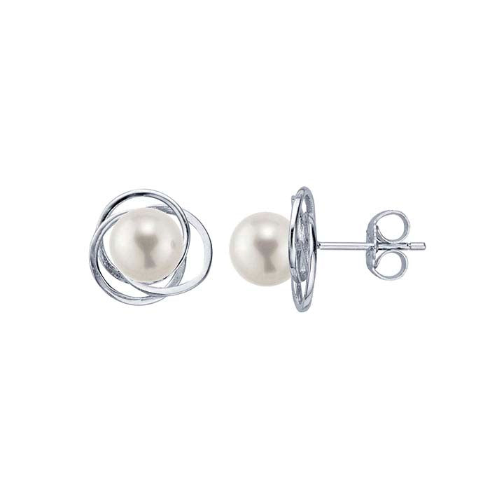 These sterling silver post earrings each feature a pearl peg in the middle of three partially flattened rings that weave around the mounting to form a love knot design. Use jeweler's epoxy to secure a pearl or gem ball to the peg to complete your design. The friction post features a groove that helps provide the most secure and comfortable fit; ear nuts are included. This ear wire is plated with rhodium to ensure a durable, tarnish-resistant finish.