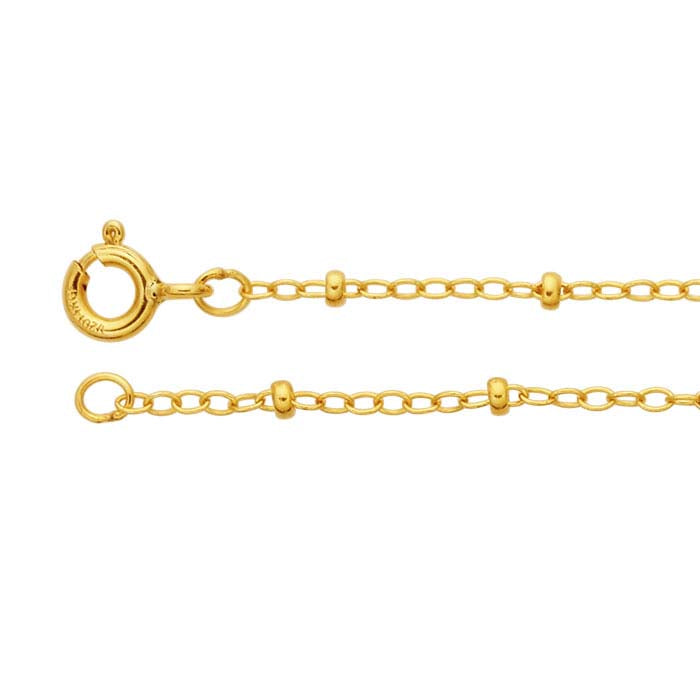 This delicate 14/20 yellow gold-filled oval cable chain features 2mm 14-karat yellow gold roundel beads evenly spaced along its length in a tin-cup style. Offer it as-is, or add a pendant to complete the look. The chain and beads are plated with 14-karat yellow gold to ensure a uniform color.The most common chain style, cable chains are formed by simply connecting single links perpendicularly end to end. Links may be round, oval or other shapes.