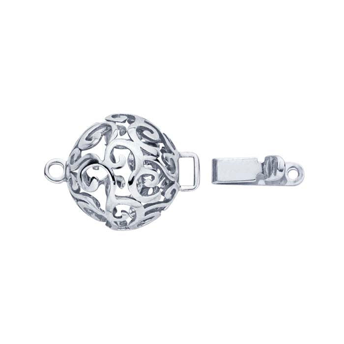 This 14-karat white gold round bead safety clasp features an intricate open swirls design and a smooth, bright finish. The clasp looks great when paired with pearl or beaded bracelets and necklaces.