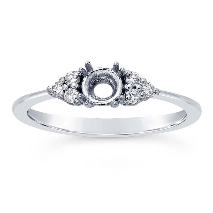 This 14-karat white gold ring mounting features a double-prong basket mounting that holds one 4.4mm (0.33-ct., approx.) round faceted gemstone. A variation on a classic 4-prong setting, which supports the gemstone on four sides, the double prongs create eight contact points for added security for your center stone. The basket setting features open sides designed to allow more light to reach and move through the stone, enhancing its brightness and brilliance. The shank is set with 6 0.02-ct. round diamonds (SI clarity/G, H color; 0.12CTTW), three on each side of the center mounting, creating a triangle shape that transitions into the shank. The shank on this ring tapers from 2mm to 1mm. Cut a seat in the prongs to accommodate your stone, then burnish the prongs over the stone to secure it in place.