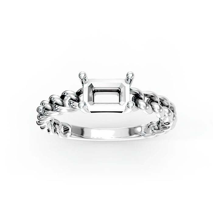 This 14-karat white gold ring mounting holds one 7 x 5mm emerald-cut faceted gemstones in a 4-prong setting. The band features a curb chain design with a sizing back at the back. Cut a seat in the prongs to accommodate your gemstone, then burnish the prongs over the stone to secure it in place.