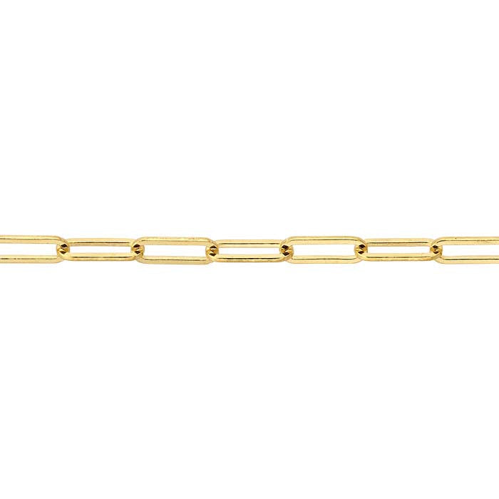 The long, flat links on this 14-karat yellow gold chain give it a streamlined look. Offer the chain as is, or use it as a foundation for your custom designs.The most common chain style, cable chains are formed by simply connecting single links perpendicularly end to end. Links may be round, oval or other shapes.