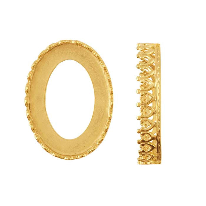This 14-karat yellow gold bezel cup holds one 12 x 10mm oval stone or glass cabochon, flat-back stone or crystal. With walls modeled from decorative gallery wire, this bezel cup adds distinctive flair to any design. This easy-to-use bezel cup saves you time and provides clean lines and a professional-looking finish. Use it to create everything from earrings to cuff links to pendants. Simply solder the bezel cup to a finding or design, and set as desired.