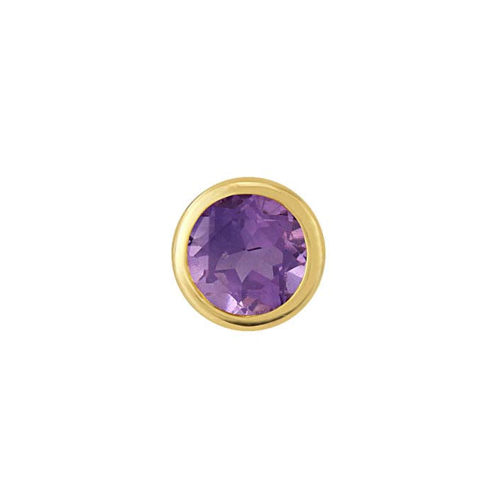This 14-karat yellow gold charm is bezel-set with a round faceted 4mm amethyst, the birthstone for February. It features two hidden openings that make it easy to add the charm to your design while keeping your piece sleek and attractive. Use it as-is for an earring drop or combine it with a variety of other charms, drops or dangles in a necklace, bracelet or anklet.
