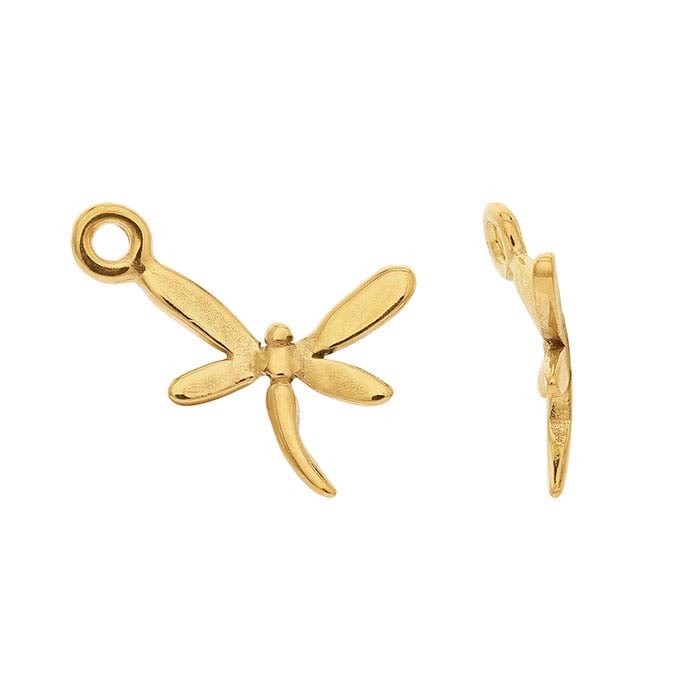 This small 14-karat yellow gold dragonfly charm features a domed shape with detail to create the body inside the wings. An attached ring is included on one wing so it will hang at an angle. Use this charm as a drop for an earring, in clusters as part of a larger design or as a jewelry tag in a finished piece.