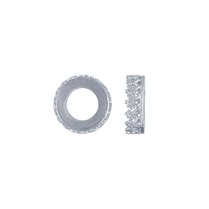 This Argentium® Silver bezel cup holds one 10mm round cabochon, flat-back stone, or crystal. With walls modeled from decorative gallery wire, this bezel cup adds distinctive flair to any design. This easy-to-use bezel cup saves you time and provides clean lines and a professional-looking finish. Simply solder the bezel cup to a finding or design, and set as desired.Made with a touch of germanium, Argentium® Silver presents a bright-white color that is closer to fine silver than traditional sterling, yet is highly resistant to firescale and less likely to tarnish under most conditions. It welds flawlessly and is ideal for fusing techniques. All Argentium is guaranteed by Argentium International Ltd. Your customers will appreciate the value and convenience of brighter-white sterling silver designs that resist tarnishing and keep on shining.
