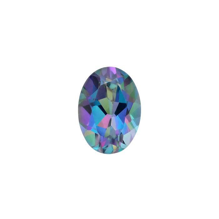 The coating on this Azotic® Galazio Blue topaz brings an iridescent shimmer to your jewelry designs. Use it to create an earring or pendant drop or use multiple gemstones in various sizes to create matched sets. Mystic topaz is produced by enhancing white topaz with a vapor deposition coating that creates vibrant flashes of color. Harsh chemicals will damage the coating; only wash with warm soap and water.A hard, usually transparent aluminum silicate gem material, faceted topaz has a brilliance that rivals more expensive gemstones, making it an economical alternative to more costly gems. Topaz forms in an orthorhombic structure with crystals that are usually prismatic. Pure topaz is colorless; impurities give the gemstone color. Gemstones can appear in a range of colors, with natural pink being the rarest. Most topaz colors are heat-treated or irradiated to enhance their color. In folklore, this gemstone is believed to dispel sadness and fear, to ward off poisons and to reverse infertility.The oval cut is an even, symmetrical shape but elongated. The arrangement of its facets is similar to that of a round brilliant, designed to maximize light and color.