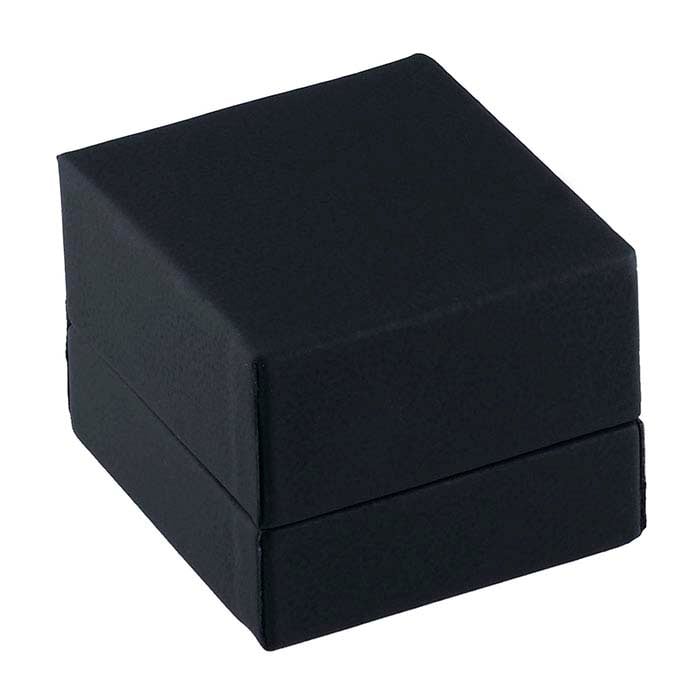 This "Midnight Collection" hinged gift box accommodates a ring and features a high-end, contemporary look. Add a decorative ribbon, gift wrapping or bow (available separately) to customize the box. Smooth, black leatherette covers the plastic box; matching-color satin covers the hinge and lines the box lid. Black flocking covers the cardboard insert. Delivered in a white cardboard sleeve.