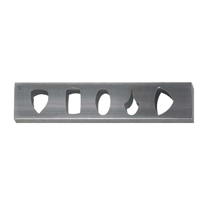 Form a variety of component shapes for your designs—consistently and accurately—with steel silhouette die plates. Use with a urethane container to focus all the force into the die plate for accurate volume shapes. Use a 60d urethane for more volume form and less detail; use a 95d urethane for more detail and less volume form. A kit including a urethane container with a stainless steel thumbscrew, a steel pusher, combination pattern die plates #1 and #3 and three urethanes (60, 80, 95d) are also available. Silhouette dimensions (L-R):