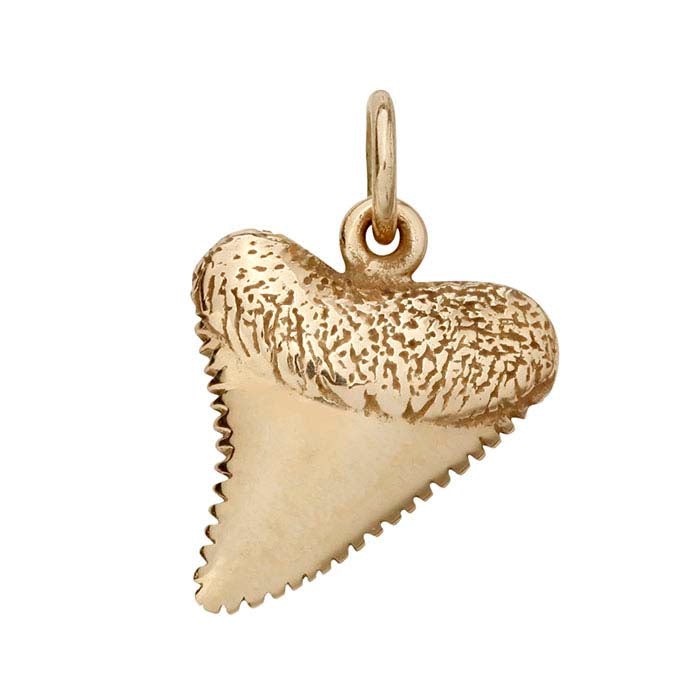 This 3D bronze shark’s tooth charm features lifelike texture and details, including the serrated edge of a real shark’s tooth. It is ideal as an addition to a bracelet, a simple drop for earrings or as one element in a themed design. The bright-finished bronze material gives the appealing look of yellow metal at an economical price that’s ideal for fashion jewelry. A closed ring (.128" ID) is included.
