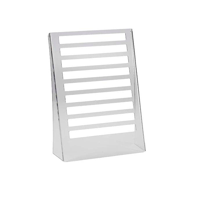 This nine-bar stand holds up to 20 2" hanging cards, allowing you to display a variety of earring designs in a limited amount of counter space. The clear acrylic becomes an effectively invisible display, placing the customer’s focus directly on the hanging cards. The bars are 1-1/4" apart; hang cards on each row, or space out the cards for increased visibility. The clear acrylic is 1/8" thick and has polished edges.