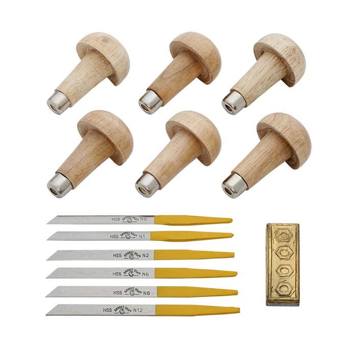 Efficiently set faceted gemstones into your designs with this kit. It includes six gravers, six wood graver handles and a model plate.