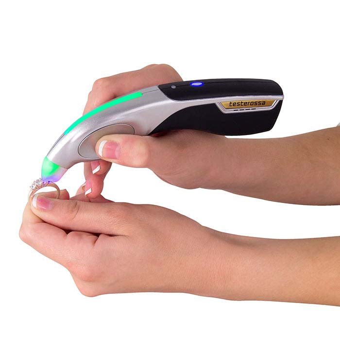 • It features a glowing light bar that provides unmistakable, color-coded visual results: GREEN for diamond, BLUE for moissanite, PINK for sapphire and RED for metal alert (which warns you if the probe touches metal as you're testing stones).