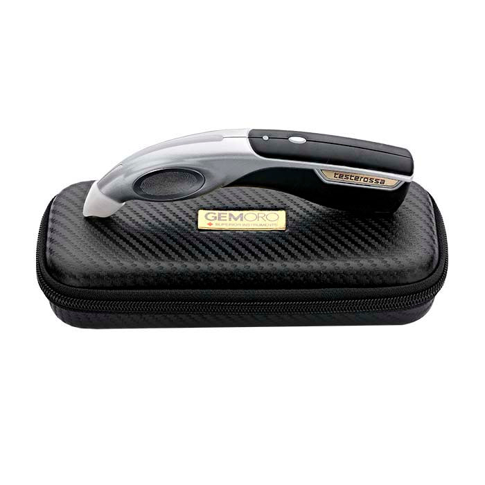 • Auto-off function helps preserve battery life. The Testarossa tester includes: a GemOro® UltraDock 3 charging station for convenient recharging, holding the tester safely ready to use and allowing cordless operation at the bench or counter, as needed; adjustable test stone magnifier attachment; loose stone holder; a protective carbon-fiber style zippered carrying case with molded insert for the tester and a convenient net pocket to hold accessories.