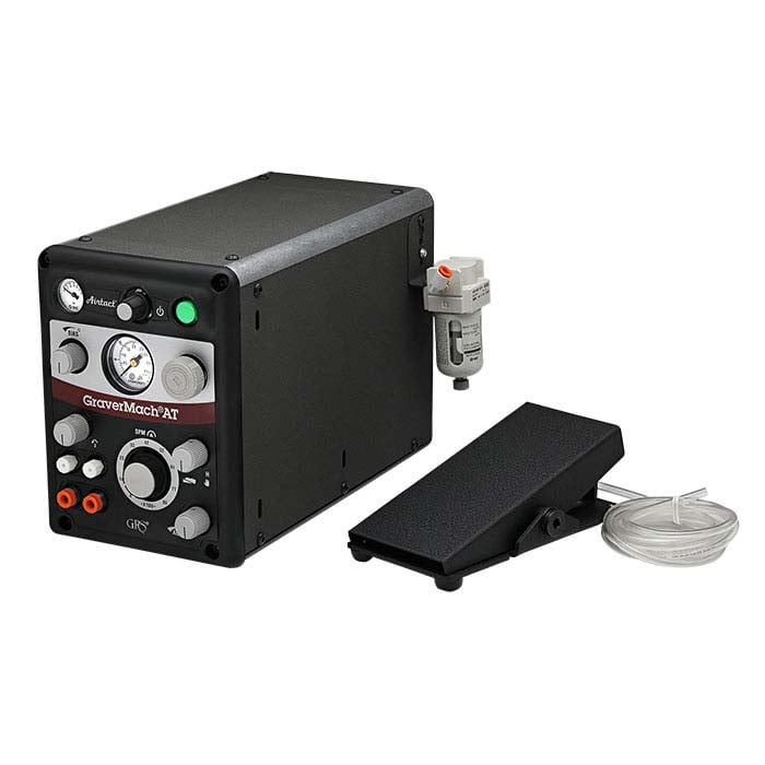 Offering versatility and precise control, the GRS® GraverMach® AT is a high-quality pneumatic air system for stone-setters and engravers. It provides precise control and consistent impact with an excellent range of power and allows you to easily change from hand- to foot-control in seconds. The unit offers a variable stroke speed and quick-connect fittings that allow the unit to work with any GRS handpiece, including Airtact™ handpieces (available separately). Three ports allow you to connect two handpieces and a rotary tool so you can quicky switch between them.