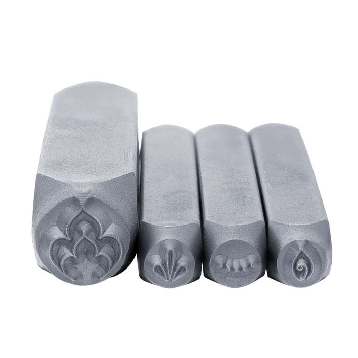 Quickly add decorative designs to your jewelry with this ImpressArt® stamp set. These stamps have straight shanks and are perfect for marking flat surfaces such as quality or brand tags, discs, stampings and other components. Each stamp is labeled on its side for easy identification and orientation. This set includes four mandala design stamps (three 4mm and one 9.5mm). ImpressArt® stamps are cut from hardened steel and tested for Rockwell hardness and perfect alignment. They are great for stamping soft metals including brass, copper, nickel silver, gold, silver and aluminum. Stamps with a straight shank have a flat tip face that's perpendicular to the tool shank. Designed to work perfectly with the specially made Ergo-Angle™ stamping hammer and Simple Strike Jig™ (each available separately), these stamps are durable, providing consistent metal-stamping success when creating custom, personalized jewelry items. For best results—and because any stamped mark is not easy to remove once it's made—it's important to practice before attempting to mark your jewelry designs. Scrap pieces of sheet or flat base metal components are ideal for helping you get the feel of both the stamp and the power needed for an effective hammer strike. Use a brass mallet to strike the stamp to help prevent damage to your stamp, and support your workpiece on a bench block or an anvil. Finally, do your stamping before setting stones so that there is no risk of damaging settings or loosening set stones.