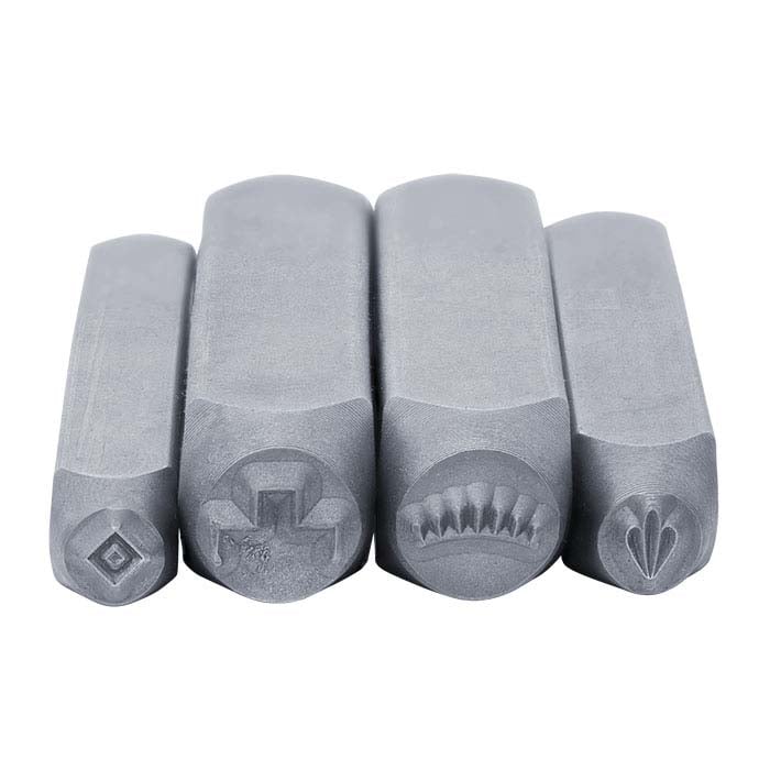 Quickly add decorative designs to your jewelry with this ImpressArt® stamp set. These stamps have straight shanks and are perfect for marking flat surfaces such as quality or brand tags, discs, stampings and other components. Each stamp is labeled on its side for easy identification and orientation. This set includes four mandala design stamps (one 3mm, one 4mm and two 6mm). ImpressArt® stamps are cut from hardened steel and tested for Rockwell hardness and perfect alignment. They are great for stamping soft metals including brass, copper, nickel silver, gold, silver and aluminum. Stamps with a straight shank have a flat tip face that's perpendicular to the tool shank. Designed to work perfectly with the specially made Ergo-Angle™ stamping hammer and Simple Strike Jig™ (each available separately), these stamps are durable, providing consistent metal-stamping success when creating custom, personalized jewelry items. For best results—and because any stamped mark is not easy to remove once it's made—it's important to practice before attempting to mark your jewelry designs. Scrap pieces of sheet or flat base metal components are ideal for helping you get the feel of both the stamp and the power needed for an effective hammer strike. Use a brass mallet to strike the stamp to help prevent damage to your stamp, and support your workpiece on a bench block or an anvil. Finally, do your stamping before setting stones so that there is no risk of damaging settings or loosening set stones.