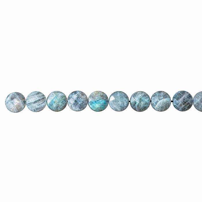 The faceted labradorite coin beads on this strand reflect light and draw the eye; an ideal choice for necklace and bracelet designs—the beads are a light bluish-gray and the amount of labradorescence varies from bead to bead. String the beads on their own to create a simple strung necklace or combine them with other gemstone and metal beads or pearls to create more complex pendants, bracelets and earrings. Complete the designs with silver or yellow-gold findings to highlight the beads’ color.Labradorite displays a unique reflection of light that is known as 'labradorescence.' This effect is due to geometric planes within the mineral structure at a submicroscopic level that are almost always oriented in one direction, but in such a way that they cannot be expressed by simple indices. Because of this, light reflecting from these planes produces an optical effect uniquely characteristic of this stone.Each package contains one temporarily strung 15"–16" strand.