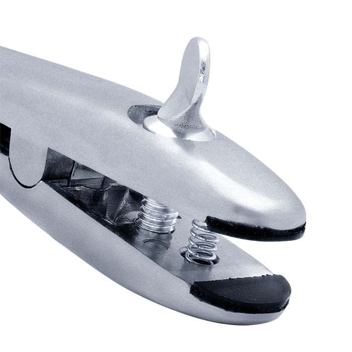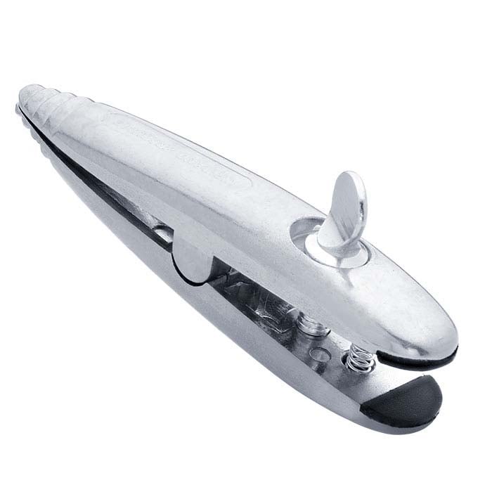Hold rings securely from the inside or outside with this metal ring clamp. Slip your ring over the stepped end and tighten the thumbscrew to work on the outside of the ring (using it as an inside-ring clamp); turn the clamp around and squeeze the stepped end to open the round, flat jaws to hold the ring while you work on the inside of the ring (using it as an outside-ring clamp).
