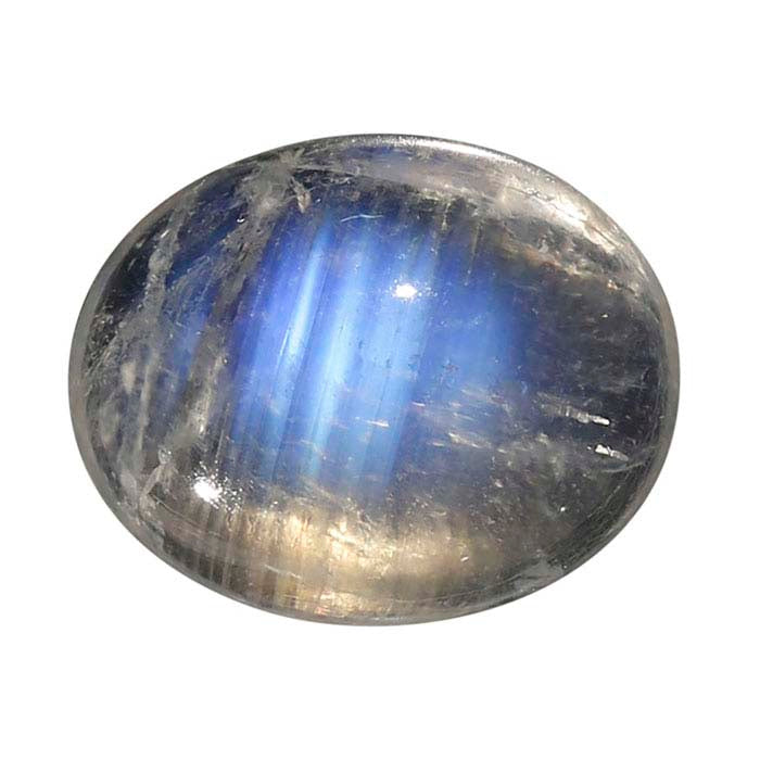 This rainbow moonstone cabochon displays an intriguing luminous surface quality that is the result of the specific crystalline structure within the gemstone. The makeup of the gem creates a dramatic shift in the appearance of the gemstone as the wearer moves, making this an eye-catching choice for custom jewelry designs.