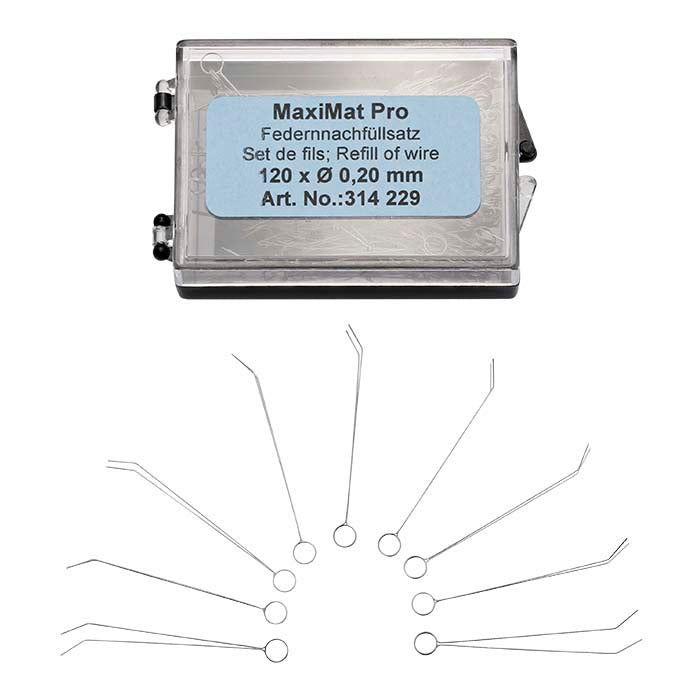 Create a beautiful textured finish—quickly and easily—with your 4"-diameter MaxiMat wire brush. These fine wire bristles (.007" diameter/.2mm) deliver an extra-fine textured finish. Bristles are created in pairs with a ring connecting them; the ring fits over the pegs inside your MaxiMat wheel hub. Open the plastic hub on your wheel and slip the ring on the end of each bristle pair over the pegs as needed to restore fullness to the brush. Each peg holds approx. 5–8 bristle pairs, depending on the wire size. Replace bristles as needed to keep the wheel performing effectively. Package includes 120 bristle pairs.