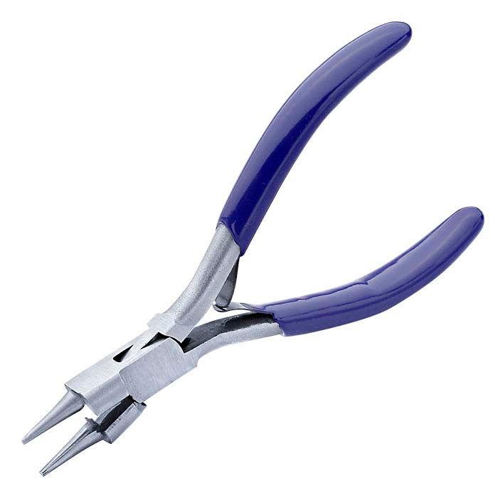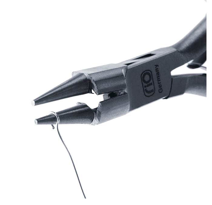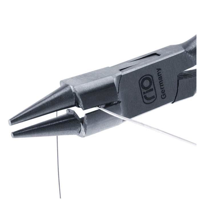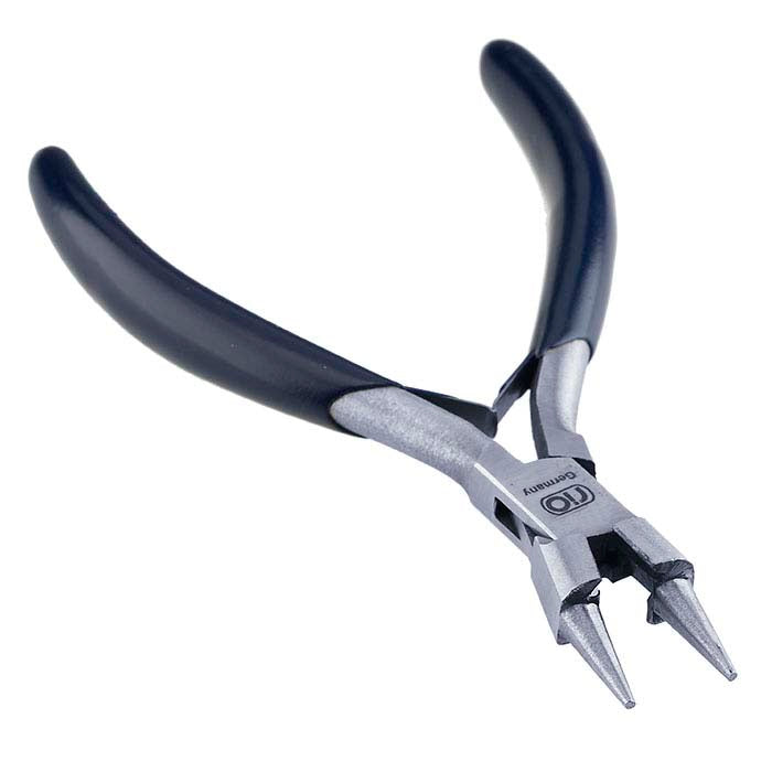 A combination of round-nose pliers and side cutters, these premium-quality, German-made rosary pliers are great for assembling chain. Rosary pliers have tapered round jaws with a wire cutter designed into the base of the jaws, near the joint; the dual-function tool is ideal for forming and trimming multiple loops without have to change tools. These pliers are made of hardened tool steel; the jaws will not be nicked or deformed with normal use. Clean with Cosmoline® or a similar protectant; avoid contact with moisture.