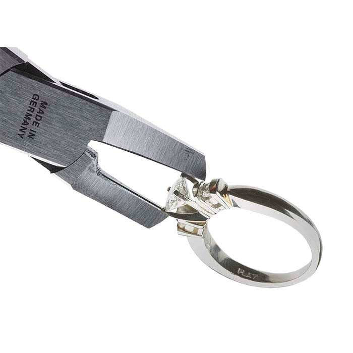 These premium-quality German stone-setting pliers have grooved and angled jaws that uniformly distribute pressure and prevent slipping, allowing you to hold prongs in the perfect position for tightening. The jaws on stone-setting pliers are specially shaped to provide easy access to prongs. The jaws on these pliers have a center groove running along their length; set the pliers so that the prongs rest in the grooves, then squeeze to tighten the prongs over the stone. The groove will keep the pliers from slipping and impacting the stone. These pliers are forged from hardened tool steel for the best combination of strength and durability; the jaws will not be nicked or deformed with normal use.