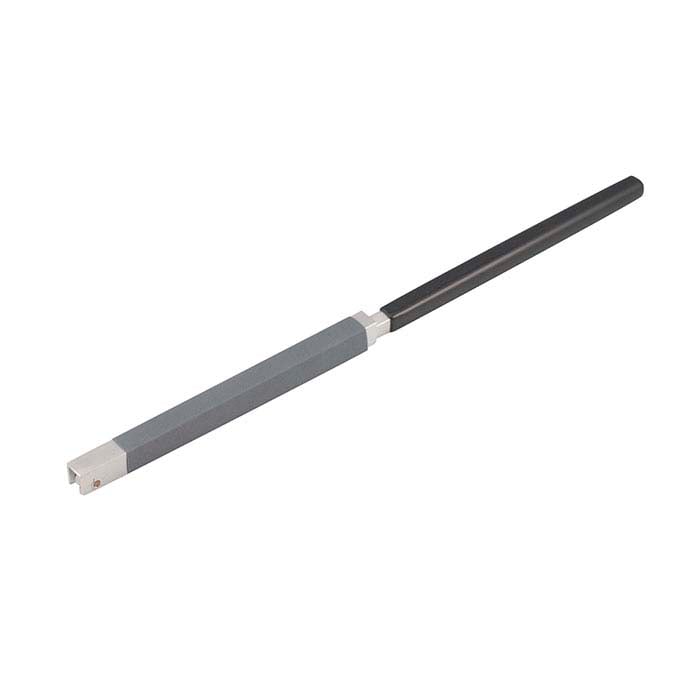 This convenient holder features a hinged square work surface that secures and supports sanding paper or polishing cloth, giving you excellent access to your workpiece. This shape is ideal for sanding, filing and polishing in corners and other fine, angled surfaces. Change abrasives in seconds, as often as you like, and re-use strips for as long as they are effective. To install the abrasive material, open the hinged cover at the tip of the tool. Cut a strip of sanding paper or cloth approximately 1-1/2"W; the length can be any length you like up to a maximum of 3-1/2". Wrap the strip lengthwise around the tip cover, tucking the edges into the cavity on the underside. Close the cover, securing the strip in place. This sturdy tool is made of lightweight, durable aluminum and has a coated, secure-grip handle.