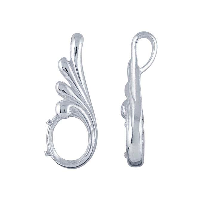 This sterling silver pendant mounting features a dimensional swirl design and a 2-prong/partial bezel mounting that holds one 10 x 8mm low-dome oval cabochon, cameo or other flat-back stone. A hidden bail at the top of the pendant gives the pendant a seamless look and makes it easy to string the pendant on cord or chain. The pendant has a bright finish; leave it bright, or oxidize the pendant to bring out the details. This cabochon mounting features a flat, open base and raised edges; the open back makes it lightweight and comfortable to wear. Set your cameo or cabochon into the mounting, then burnish the bezel wall and prongs over the stone to secure it in place.
