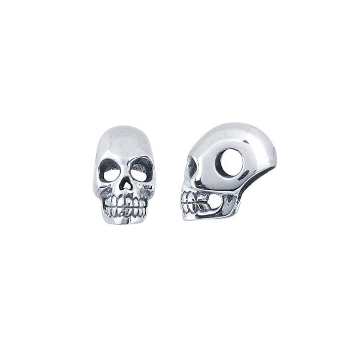 This sterling silver skull bead bead features a three-dimensional detail and a hollow design, making it lightweight and comfortable to wear. The open design highlights the eye sockets and nose opening while allowing your cord or chain to slightly peek through, providing interesting design possibilities especially when using colorful cord or contrasting metal colors. The side-drilled hole makes the bead an ideal addition to necklace or bracelet designs; a second side-drilled hole that is behind the teeth (approximately 1.2mm) allows you to unite two strands for a custom look. Add this bead to a straight-leg ear wire before finishing the end of the wire by shaping it into a loop to accept drops or dangles. This bead presents a smooth bright finish.